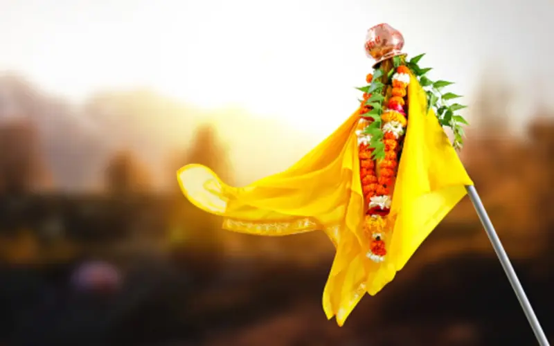 The celebration involves raising a 'Gudi', a decorative flag-like structure that is placed outside homes or on balconies. Typically, it consists of a vibrant cloth tied to a bamboo pole, embellished with neem leaves, mango leaves, flowers, and an inverted silver or copper pot at the top. The Gudi is viewed as a symbol of victory, prosperity, and good fortune.
