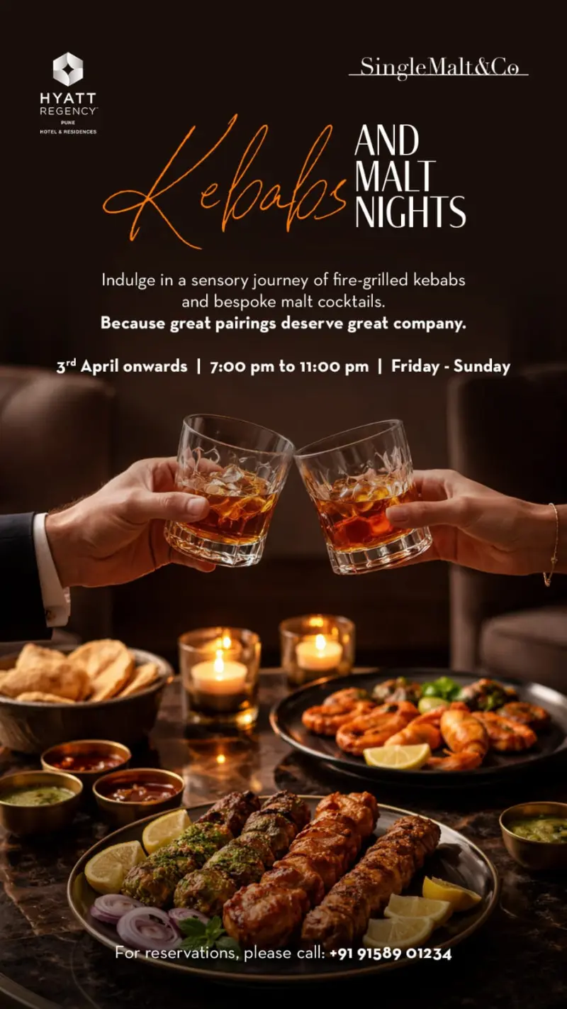 Kebabs & Malt Nights begins 3rd April and continues every Friday to Sunday, from 7:00 PM to 11:00PM at Single Malt & Co., Hyatt Regency Pune & Residences. Guests are encouraged to reserve in advance for a seamless dining experience.