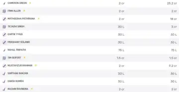 All-Rounders: Sunil Narine, Cameron Green, Anukul Roy, Sarthak Ranjan, Daksh Kamra, Rachin Ravindra, Ramandeep Singh