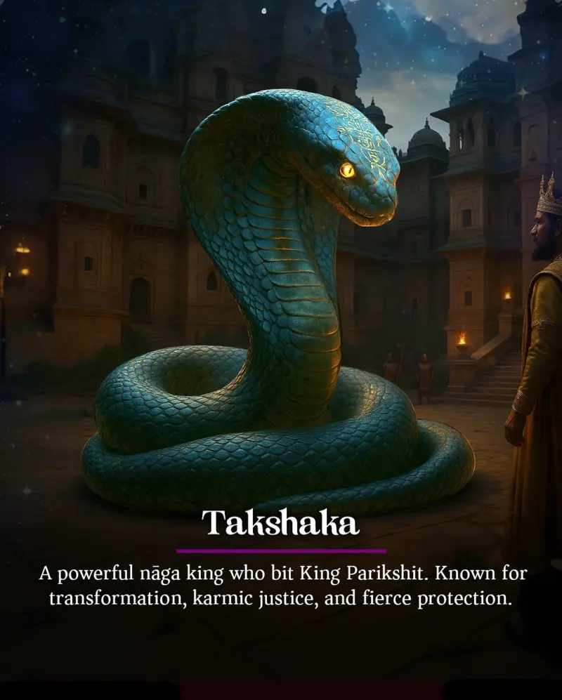 Takshaka: A powerful serpent king, prominent in the Mahabharata.