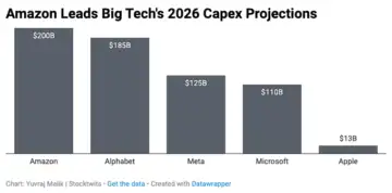 - Amazon on Thursday forecast that its capex would increase by over 50% to $200 billion this year, sending its stock price plummeting despite strong results.