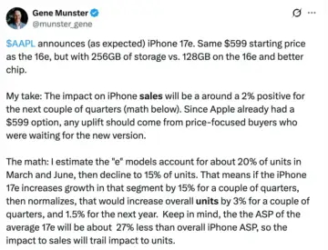 - Munster also noted that the average selling price (ASP) of iPhone 17e would be about 27% lower compared to the overall iPhone's ASP, "so the impact to sales will trail impact to units."