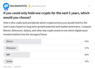 Results of an ongoing Stocktwits poll asking traders about which crypto they would for the next 5 years based on long-term growth potential and market dominance on March 6 as of 2:00 a.m. ET | Source: StocktwitsWhat Is Retail Saying?