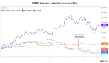And Robinhood? Its stock has been on an absolute tear - HOOD is up more than threefold this year - helped in part by its aggressive push into prediction markets. The company rolled out its prediction-market hub with Kalshi in March and, just last month, snapped up a 90% stake in MIAX Derivatives Exchange, a move that sent its shares sharply higher.