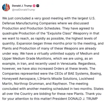 - Trump said the meeting included CEOs of top U.S. defense companies, including Boeing, Honeywell, Lockheed Martin, and Northrop Grumman, among others.