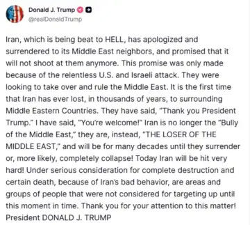 Donald Trump said in a post on his social media account on Saturday that Iran has "apologized and surrendered" to its neighbors in the Middle East after what he called "relentless military pressure" from the US and Israel.