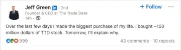 "$TTD this is a multiday runner. Don't be surprised to see more insider buys," said a user, while several predicted that shares could go up to $50.