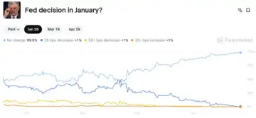 Polymarket prediction market bets on Fed rate cut in January, as on Jan. 26 | PolymarketMeanwhile, U.S. equities gained in Monday's opening trade. At the time of writing, the SPDR S&P 500 ETF (SPY), which tracks the S&P 500 index, was up by 0.44%, the Invesco QQQ Trust ETF (QQQ) rose 0.4%, while the SPDR Dow Jones Industrial Average ETF Trust (DIA) gained 0.36%. Retail sentiment around the S&P 500 ETF on Stocktwits was in the 'extremely bearish' territory.