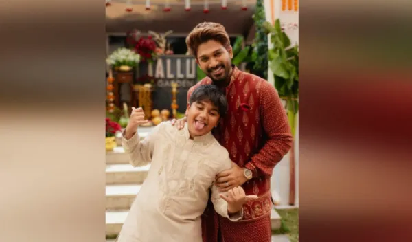 In the picture, Allu Arjun is seen dressed in a maroon traditional kurta, smiling as he holds Ayaan close.