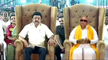 At the event, an empty chair was placed beside Stalin's seat while a projection showed Karunanidhi delivering a speech, giving the impression that he was virtually present on stage.