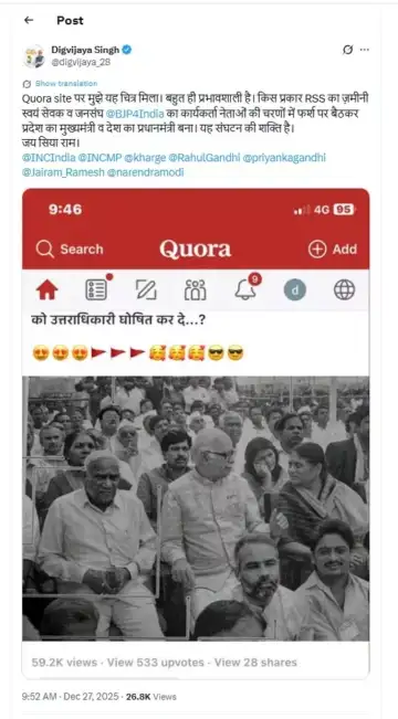 Singh, who tagged Congress's social media handles, party chief Mallikarjun Kharge, and MPs Rahul Gandhi and Priyanka Gandhi Vadra in a post, praised how grassroots-level workers who sat on the floor at party events could become a Chief Minister and Prime Minister under the organisational framework of the RSS and the BJP. He further stated that the photo shows the power of the organisation.