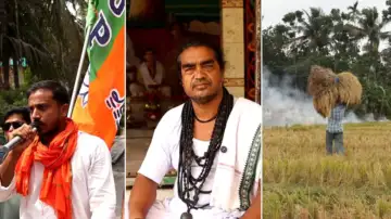 (From left), BJP leaders on their way to a campaign rally of Prime Minister Narendra Modi in Thakurnagar in North 24 Parganas of West Bengal; Anand Biswas, a Matua religious leader whose name has been deleted from the voter list; and a local agriculturalist in the Matua belt of North 24 Parganas. Photo: Abhishek Sharma