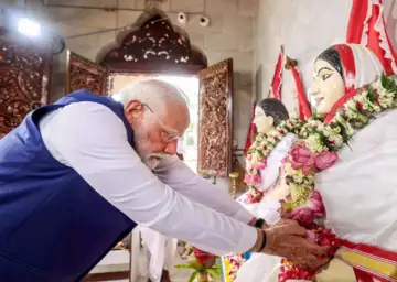 Prime Minister Narendra Modi on April 26 pays obeisance during a visit to Matua Thakur Temple in Thakurnagar in West Bengal's North 24 Parganas district that will vote in the Assembly polls on April 29, 2026. Photo: @narendramodi/X via PTI