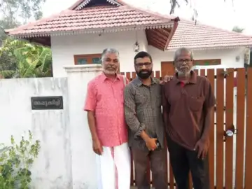 PV Sukumaran (centre) with writer Perumal Murugan (left) & Yuma Vasuki, who had won the Sahitya Akademi award for his Tamil translation of Khasakkinte Ithihasam, outside the house in Thasarak named after Appu-Kili. Photo: By special arrangement