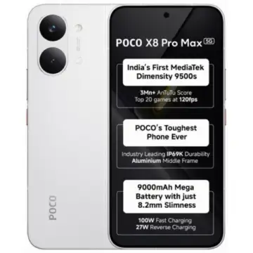 The Poco X8 Pro Max 5G comes in 12GB + 256GB and 12GB + 512GB variants, priced at Rs 42,999 and Rs 46,999, respectively. It is available in Black, White, and Blue shades. Buyers can avail a Rs 3,000 discount with SBI, ICICI, and HDFC bank cards. It will be available for sale exclusively via Flipkart from March 23, 12 pm onwards.