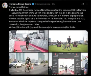 Guwahti: In a celebratory moment, Assam Chief Minister Himanta Biswa Sarma's son Nandil Sarma demonstrated endurance and determination to finish the coveted Ironman 70.3 race in Bahrain.