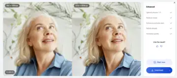 After processing, you'll see a side-by-side comparison. You can zoom in a bit, and you'll notice details coming back-eyes sharper, skin textures more defined. It's subtle but also kind of obvious.