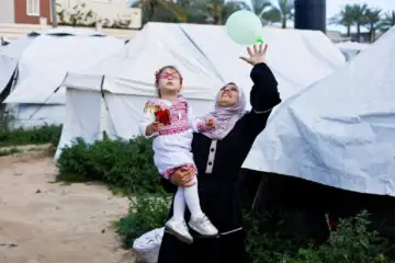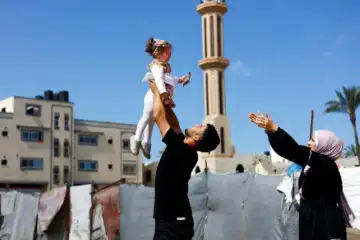 Maternal uncle of Bissan, who was evacuated as a premature baby during the two-year Israeli offensive for treatment in Egypt, plays with her after she returned to Gaza as her Palestinian mother Sundus al-Kurd reaches her arms out, in Deir al-Balah in the central Gaza Strip, March 31, 2026.