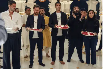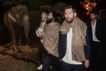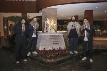 8 12 In this image received on Dec. 16, 2025, Argentine footballers Lionel Messi and Rodrigo De Paul, Uruguayan footballer Luis Suarez with Reliance Industries Chairman Mukesh Ambani's son Anant Ambani and his wife Radhika Merchant perform 'aarti' during a visit at Vantara, a wildlife rescue, rehabilitation and conservation centre, in Jamnagar, Gujarat. (Vantara via PTI Photo)