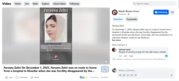 The Baloch Women's Forum announced the disappearance of Farzana Zahri on January 3, 2026. Source: Facebook.