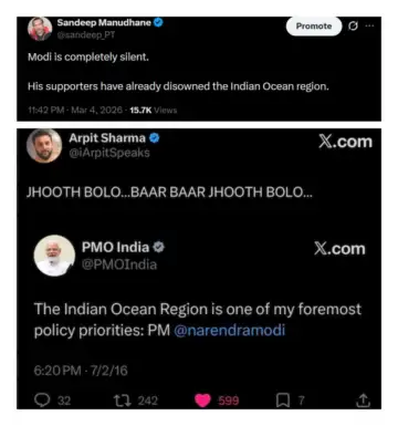 Posts by @sandeep_PT and @iArpitSpeaks on India's silence over the sinking of an Iranian ship by the US Navy were ordered deleted. The latter post dredged up a 2016 tweet by Modi about the importance of the importance of the Indian Ocean region for him and essentially called the prime minister a liar: