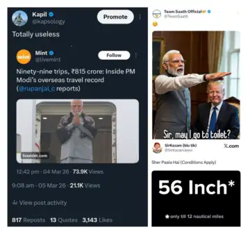 A post by the handle 'Team Saath Official' reading "Yeh to darr gayi sarkar" [This government is scared] featuring an edited image of Modi saluting Trump was blocked. The image included the text, "Sir, may I go to toilet?". A post by @kapsology which added the words 'Totally useless' to a tweet by Mint newspaper about the amount spent on Modi's foreign trips was also ordered deleted.