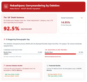 Taken together, these findings suggest that the SIR's two biggest social victims were Muslim voters and the Matua community. In Mothabari and Nakashipara, the burden fell overwhelmingly on Muslim-concentrated booths, shrinking an electorate that forms the core of opposition strength in those constituencies.