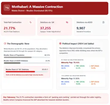 The most dramatic case is Mothabari, where the voter roll appears to have contracted by 21.77%, amounting to 46,274 deletions in a constituency with a 60.15% Muslim population.