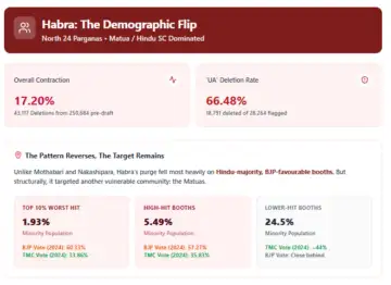 The macro picture itself is striking. Habra’s pre-draft roll of roughly 2,50,684 voters saw an overall contraction of 17.20% amounting to 43,117 deletions. That is extraordinarily high for a standard revision cycle, which, as noted earlier, would normally be expected to remain in the low single digits.