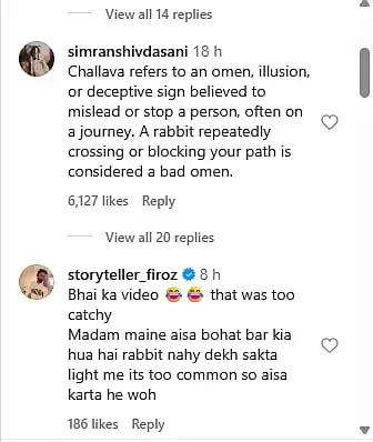 The video quickly drew mixed reactions online. Some users linked the incident to folklore. One comment read, "Challava refers to an omen, illusion, or deceptive sign believed to mislead or stop a person, often on a journey. A rabbit repeatedly crossing or blocking your path is considered a bad omen."