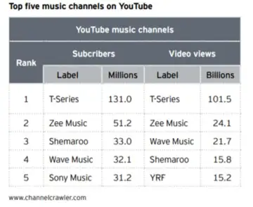 T-Series leads the chart with the highest number of subscribers and with the highest number of video views, followed by Zee Music.