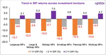 Across categories, SIP returns remained firmly negative over shorter time horizons. As shown in the chart below, the most popular small and flexi-cap categories have given an average negative return of ~15% and ~14%, respectively, over the last year.