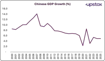 China's GDP growth rate has slowed from the highs of 10% in the 2000s to under 5% in 2025. In fact, for 2026, China has set a target of 4.5-5%, the lowest since 1991.