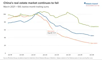 Roughly 70% of Chinese household wealth was tied up in real estate (compared to ~30% in the US). China's "Three Red Lines" policy was introduced in 2020 to deleverage developers like Evergrande. This began a long slump in the Chinese real estate market, which entered its fifth year in 2026. Once again, while the government's intention was to contain the contagion, it didn't just stop construction but broke the investor trust.