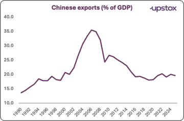 Second, since the Global Financial Crisis, China has progressively pivoted its focus within the country. Consequently, exports have been taking a backseat, as seen in the chart below.