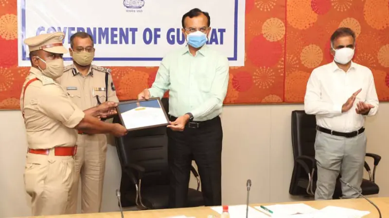 રાજ્યમાં પ્રવર્તી રહેલ કોરોનાની સાંપ્રત પરિસ્થિતિમાં ગુજરાત પોલીસે કરેલી કામગીરીને બિરદાવીને શ્રેષ્ઠ કામગીરી કરનાર પોલીસ અધિકારી-કર્મચારીઓને પ્રશંસાપત્ર એનાયત કરીને ગૃહ રાજ્ય મંત્રી પ્રદિપસિંહ જાડેજાએ સન્માન કર્યું હતું. આ વેળાએ ગૃહ વિભાગના અધિક મુખ્ય સચિવ પંકજકુમાર, રાજ્યના પોલીસ વડા આશિષ ભાટીયા ઉપસ્થિત રહ્યા હતા.