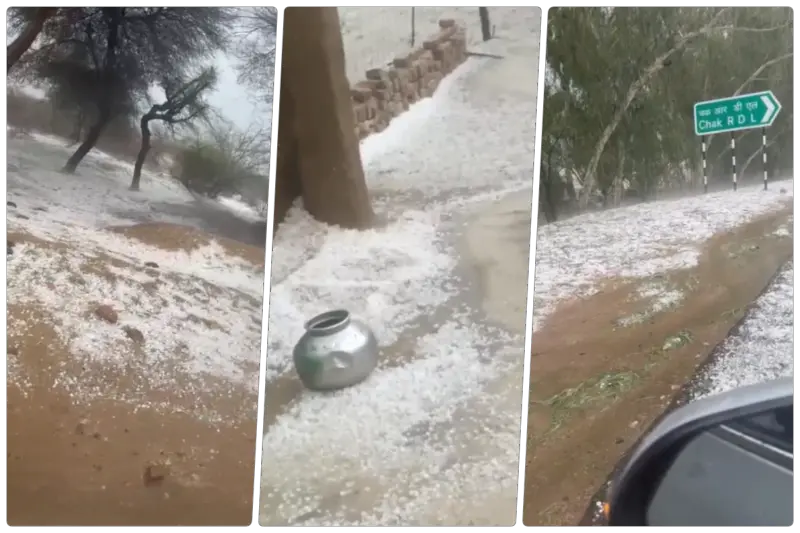 राजस्थान में 3 अप्रैल 2026 को मौसम ने अचानक करवट ली. तपते रेगिस्तान में ओले गिरे और कई जगहों पर जमीन सफेद हो गई. जैसलमेर और बीकानेर में तेज ओलावृष्टि हुई. अजमेर-ब्यावर में तेज आंधी ने काफी नुकसान पहुंचाया.