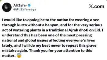इस पर अली जफर ने सोशल मीडिया प्लेटफॉर्म एक्स पर एक पोस्ट शेयर कर जवाब दिया। उन्होंने मजाकिया और व्यंग्यात्मक अंदाज में माफी मांगते हुए लिखा कि वह ईद के दिन बिना बनियान के कुर्ता पहनने और पारंपरिक अजरक धोती पहनकर पौधों को पानी देने जैसे गंभीर काम करने के लिए देश से माफी चाहते हैं।