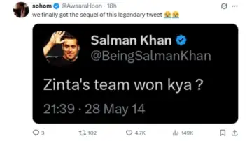 Salman Khanफैंस ने सलमान के इस ट्वीट की तुलना उनके 2014 के पुराने पोस्ट से की, जिसमें उन्होंने पूछा था, 'जिंटा की टीम जीती क्या?' यूजर्स ने इसे मजाकिया अंदाज में कहा कि 12 साल बाद इस पोस्ट का सीक्वल आया है। इसे लेकर कई मीम्स भी शेयर किए गए। कुछ लोगों ने तो सोशल मीडिया पर 'टाइगर जिंटा है' जैसे मजेदार कमेंट्स भी देखने को मिले।
