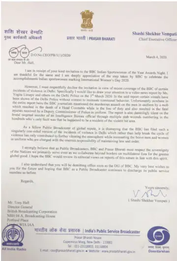 वेम्पती ने पत्र में बीबीसी की एकतरफा पत्रकारिता के लिए आलोचना करते हुए कहा है कि बतौर पब्लिक ब्रॉडकास्टर बीबीसी को देश की संप्रभुता का आदर करना चाहिए। उन्होंने उम्मीद जताई है कि बीबीसी आगे से इस बात का ध्यान रखेगी।