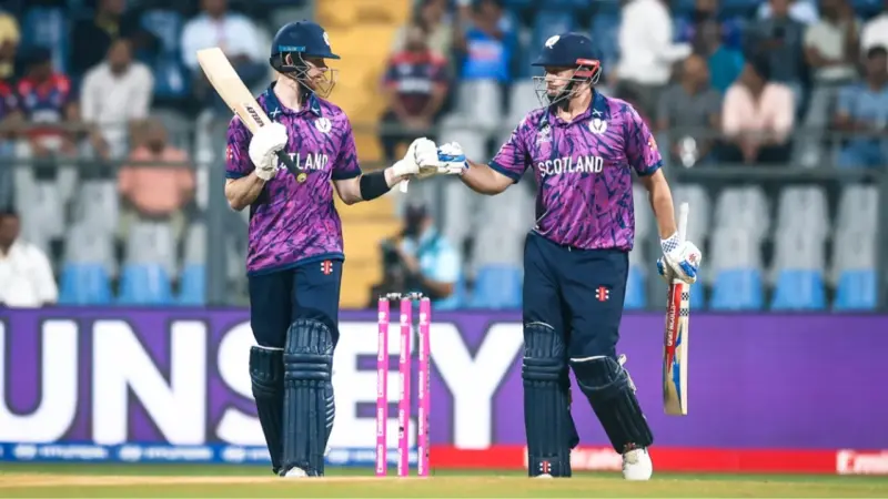 ग्रुप सी में मौजूद ये दोनों ही टीमें इस टूर्नामेंट से बाहर हो चुकी है। दोनों टीमों आज जीत के साथ अपने अभियान को खत्म करना चाहेंगे।मंगलवार को वानखेड़े स्टेडियम में जारी मुकाबले में नेपाल के कप्तान रोहित पौडेल ने टॉस जीतकर स्कॉटलैंड को पहले बल्लेबाजी के लिए आमंत्रित किया। स्कॉटलैंड को जॉर्ज मुन्से और माइकल जोन्स ने शानदार शुरुआत दिलाई। दोनों सलामी बल्लेबाजों ने 10 ओवरों में 80 रन जुटाए।