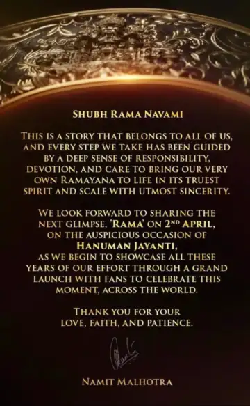 तो वहीं उसके साथ ही दर्शकों को इंतजार था कि फिल्म का टीजर रामनवमी के दिन रिलीज किया जाएगा। लेकिन ऐसा नहीं हुआ है। अब जाकर फिल्म के मेकर्स ने Ramayana Movie के फर्स्ट ग्लिम्प्स को लेकर ऑफिशियल स्टेटमेंट दे दी है। चलिए जानते हैं रामायण मूवी का टीजर कब आएगा।