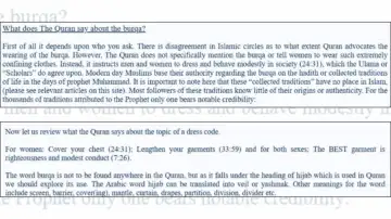 कुरान इस्लाम की बेवसाइट के ट्रू इस्लाम में जानकारी दी गई है। इसका टाइटल ‘बुर्का- इस्लामी या सांस्कृतिक?’। कुरान में ‘हिजाब’ शब्द का जिक्र सात बार आया है। लेकिन इसका इस्तेमाल महिलाओं के पहनावे या ड्रेस कोड के संदर्भ में नहीं किया गया है। वहाँ हिजाब का अर्थ एक ‘पर्दा’ या ‘अवरोध’ (Barrier) है, जो दो चीजों के बीच अलगाव पैदा करता है। कुरान की आयत 24:31 और 33:59 शालीनता (Modesty) की बात करती हैं। आयत 24:31 महिलाओं को अपना ‘सीना’ (जयब) ढकने का निर्देश देती है, न कि चेहरे या बालों को पूरी तरह ढँकने का।