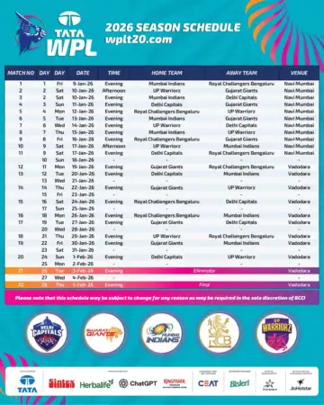 इसी कारण डब्ल्यूपीएल 2026 के मुकाबले नवी मुंबई के डीवाई पाटिल स्टेडियम और वडोदरा के कोटंबी स्टेडियम में आयोजित किए जाएंगे। पहले 11 मैच नवी मुंबई में होंगे, जबकि बाकी 11 मुकाबले, जिनमें एलिमिनेटर और फाइनल शामिल हैं, वडोदरा में खेले जाएंगे।