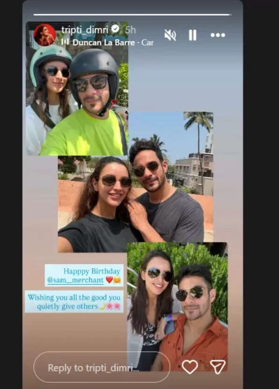 तृप्ति ने अपने इंस्टाग्राम पर सैम मर्चेंट को जन्मदिन की बधाई देते हुए तीन तस्वीरों का एक कोलाज साझा किया है। इन तस्वीरों में तृप्ति मुस्कुराते हुए दिख रही हैं। एक तस्वीर में दोनों ने हेलमेट पहना हुआ है, जबकि दूसरी में सैम ने तृप्ति के कंधे पर हाथ रखा है। तीसरी तस्वीर में तृप्ति ने सैम के कंधे पर हाथ रखा है। इन तस्वीरों के साथ तृप्ति ने लिखा, 'जन्मदिन मुबारक हो सैम। भगवान आपका भला करे। आप चुपचाप दूसरों को बहुत कुछ देते हो।'