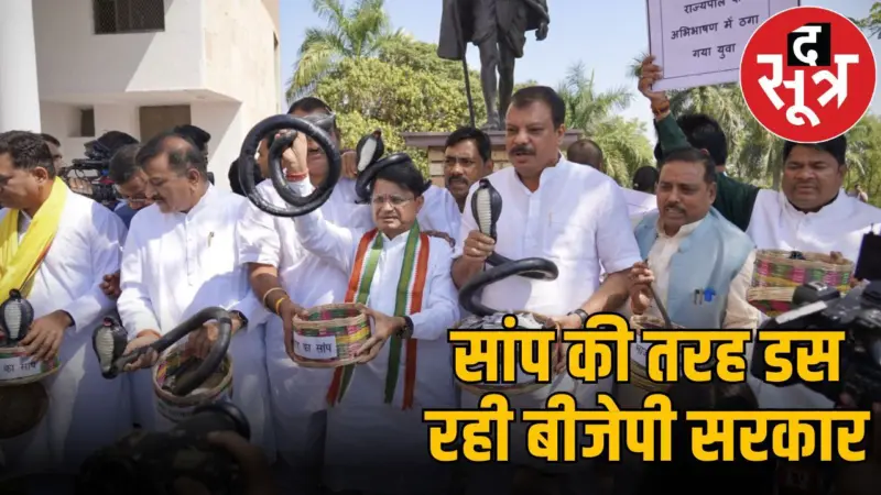 कांग्रेस विधायकों ने बेरोजगारी के मुद्दे पर सरकार को घेरते हुए प्लास्टिक के सांपों के साथ प्रदर्शन किया। गांधी प्रतिमा के सामने इकट्ठा होकर उन्होंने बीजेपी सरकार पर नौकरियों को रोकने का आरोप लगाया।