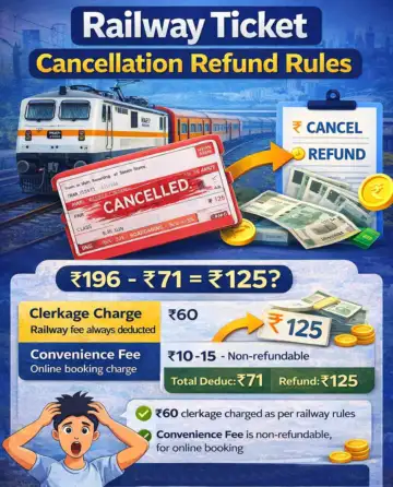वेटिंग लिस्ट ई-टिकट के ऑटोमैटिक कैंसिल होने पर पूरा पैसा वापस नहीं मिलना कोई स्कैम नहीं, बल्कि रेलवे के तय नियमों का हिस्सा है. इसमें ₹60 क्लर्केज चार्ज और IRCTC की कन्वीनियंस फी नॉन-रिफंडेबल होती है. इसलिए यूजर को सिर्फ बेस किराया वापस मिलता है, जिससे रिफंड कम दिखाई देता है.