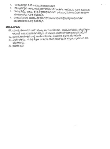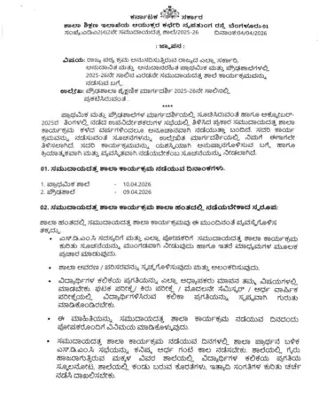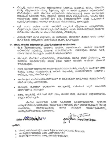 - SSLC ಮೌಲ್ಯಮಾಪನ: ಏಪ್ರಿಲ್ 8 ರಿಂದ SSLC ಮೌಲ್ಯಮಾಪನ ಕಾರ್ಯ ಪ್ರಾರಂಭವಾಗಲಿದ್ದು, ಮೌಲ್ಯಮಾಪನಕ್ಕೆ ತೆರಳುವ ಶಿಕ್ಷಕರನ್ನು ಹೊರತುಪಡಿಸಿ ಉಳಿದ ಶಿಕ್ಷಕರು ಶಾಲೆಯಲ್ಲಿ ಈ ಕಾರ್ಯಕ್ರಮ ನಡೆಸಬೇಕು.