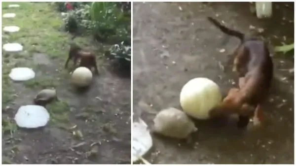 ನೀರಲ್ಲಿ ಅತಿ ಶಾಂತವಾಗಿ, ನಿಧಾನವಾಗಿ ಓಡಾಡಿಕೊಂಡಿರುವ ಆಮೆ ಹಾಗೂ ಸದಾ ಚುರುಕಾಗಿರುವ ನಾಯಿ ಸ್ನೇಹದಿಂದ ಫುಟ್ಬಾಲ್ ಆಡುವ 43 ಸೆಕೆಂಡ್ ಗಳ ವಿಡಿಯೋವು @gnuman1979 ಎಂಬ ಟ್ವಿಟರ್ ಖಾತೆಯಲ್ಲಿ ಅಪ್ ಲೋಡ್ ಆಗಿದೆ. ವಿಡಿಯೋವನ್ನು 172.4 ಸಾವಿರ ಜನ ವೀಕ್ಷಿಸಿದ್ದಾರೆ. ಸಾಕಷ್ಟು ಲೈಕ್, ಕಮೆಂಟ್ ಗಳು ಬಂದಿವೆ.