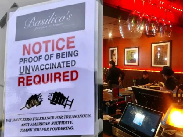 ಕ್ಯಾಲಿಫೋರ್ನಿಯಾದ ಹಂಟಿಂಗ್ಟನ್ ಬೀಚ್ನಲ್ಲಿರುವ ಬೆಸಿಲಿಕೋಸ್ ಪಾಸ್ತಾ ಎ ವಿನೋ ಹೆಸರಿನ ಈ ರೆಸ್ಟೋರಂಟ್ನಲ್ಲಿ ಮಾಸ್ಕ್ ಹಾಕದೇ ಇದ್ದರೆ ಮಾತ್ರವೇ ಪ್ರವೇಶ ನೀಡುವುದಲ್ಲದೇ, ಕೋವಿಡ್ ಲಸಿಕೆ ಪಡೆಯದೇ ಇರುವ ಸಾಕ್ಷಿ ತೋರಿದರೆ ಮಾತ್ರವೇ ಎಂಟ್ರಿ ಸಿಗುತ್ತದೆ.
